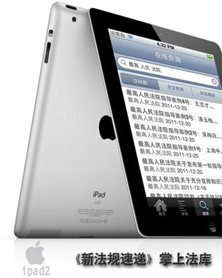 一臺預裝了《新法規速遞》軟件的蘋果/Apple iPad 2 wifi版16G,是您的掌上法律數據庫。
