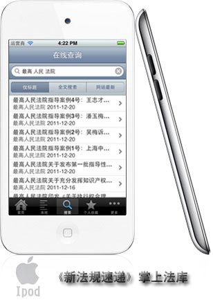 一臺預裝了《新法規速遞》軟件的蘋果/Apple iPod touch 4,是您的掌上法律數據庫。