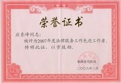仙居司法局授予應東峰律師法律服務先進工作者榮譽證書